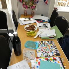 Our exhibition, DO UC US? is the result of a year long collaboration. The organising team had several months of designing and planning the project. The Steph worked in partnership with public co-producers, PJ and Lisa, to design and deliver the programme of workshops. The project began in February 2023 and all of our sessions were held in the warm and welcoming setting of St Vincent's, Byker and SVP Deaf Centre Newcastle, often featuring glorious home cooked food. The project developed and grew from our original plan as we collaborated and tailored the project to the needs of the group. Our team (Steph, PJ, Lisa, Suzanne & Jacques) facilitated a series of workshops, art drop-ins and discussion sessions. We also collaborated with Cap-a-pie who delivered a fantastic creative writing and drama workshop. Our exhibition was held after four months of almost weekly collaboration in-person (with options to join remotely via Zoom) with the UC CREATIVES group members. What you see in our DO UC US? exhibition has been curated collaboratively and the art work belongs to our 7 CREATIVES.